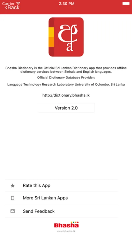 Bhasha English-Sinhala Dictionary is Sri Lanka's Official Sinhala-English Dictionary app for SmartPhones brought to you by Bhasha Lanka (Pvt) Ltd in partnership with Language Technology Research Laboratory, Sri Lanka.