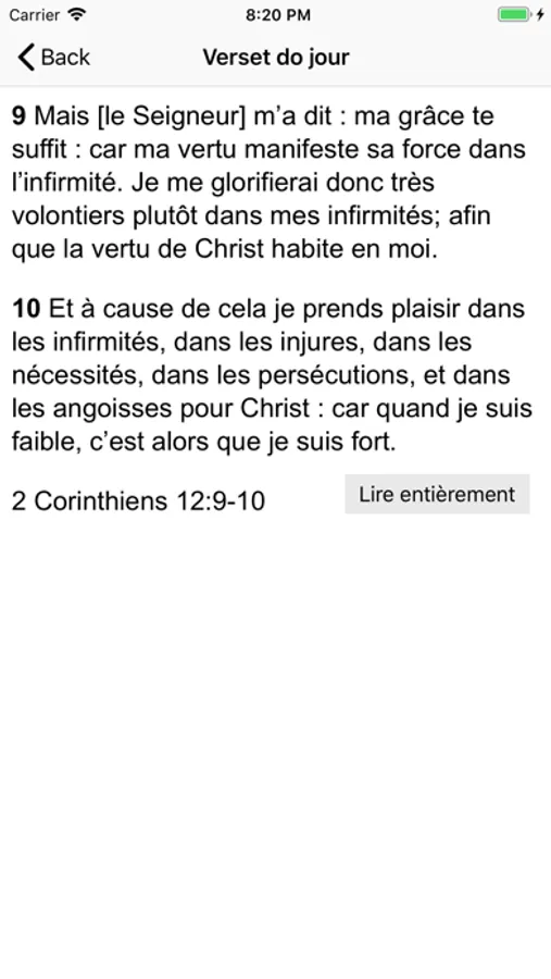 - Suivi de votre lecture: lorsque vous ouvrez l'application Sainte Bible Gratuit, vous pourrez reprendre votre dernière lecture. En outre, la Sainte Bible comprend un lien vers une application qui vous aidera à lire la Bible en un an.