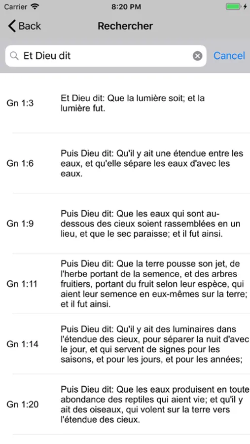 - Moteur de recherche: Si vous avez oublié où se trouve un verset de la Bible, vous pouvez en saisir une partie dans le moteur de recherche pour trouver le livre et le chapitre de la Sainte Bible Gratuit. Puisque le moteur de recherche effectue une recherche dans la Bible installée sur le périphérique mobile, une connexion Internet n'est pas nécessaire pour fonctionner.