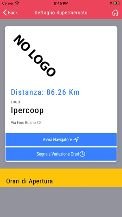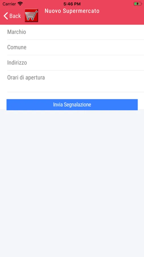 Selezionando la voce "SEGNALA NUOVO SUPERMERCATO", avrai la possibilità di rendere ancora più completa questa APP. Infatti, è proprio grazie alle vostre segnalazioni che questo strumento può diventare ogni giorno sempre più preciso, aggiungendo nuovi supermercati presenti sul territorio.