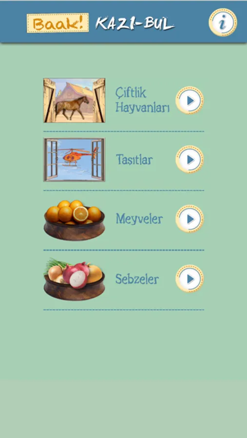 Meyveler: Çocuğunuz, kapları kazıyarak meyveleri bulacak ve okunuşlarını öğrenip dinleyecektir.