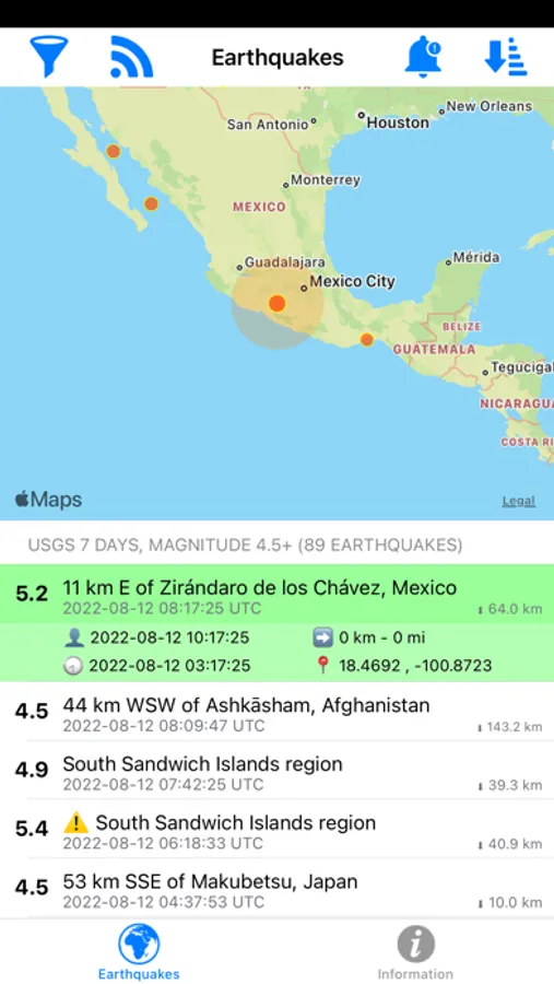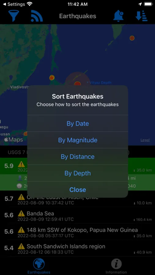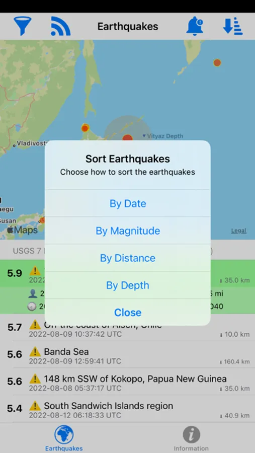 You can see all earthquakes sorted by magnitude, date, distance or depth.