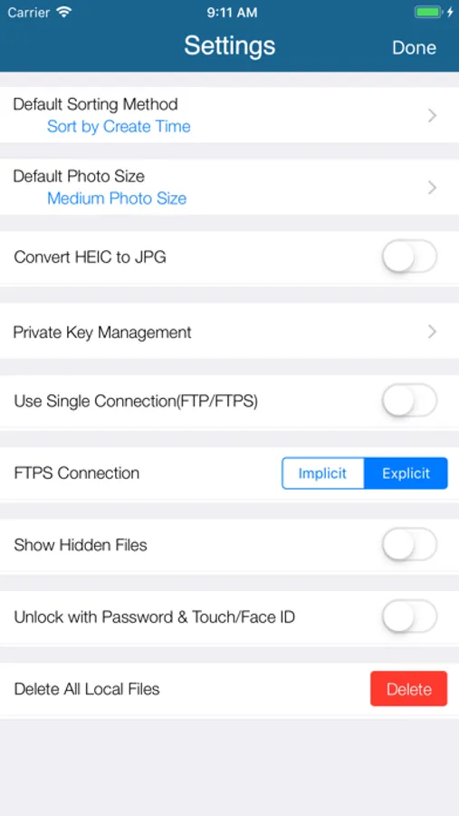 3. Support both user name/password and Private Key authentication for SFTP. Support both PPK and PEM keys. Support importing keys from/exporting keys to iCloud Drive under iTransfer/keys folder.