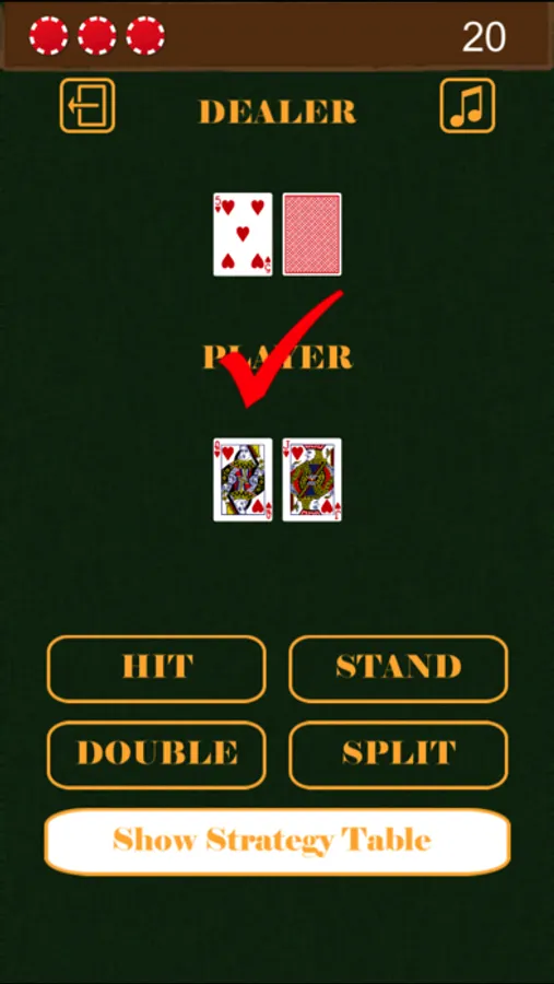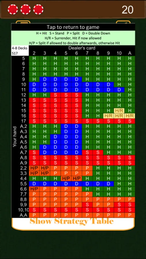 The strategy is only based on the dealer's card and your cards in a round. You will not need to count or memorize cards (Counting cards or memorizing cards will be a more advanced strategy). Inside the app, there is a "Show Strategy Table" button which shows the basic strategy table.