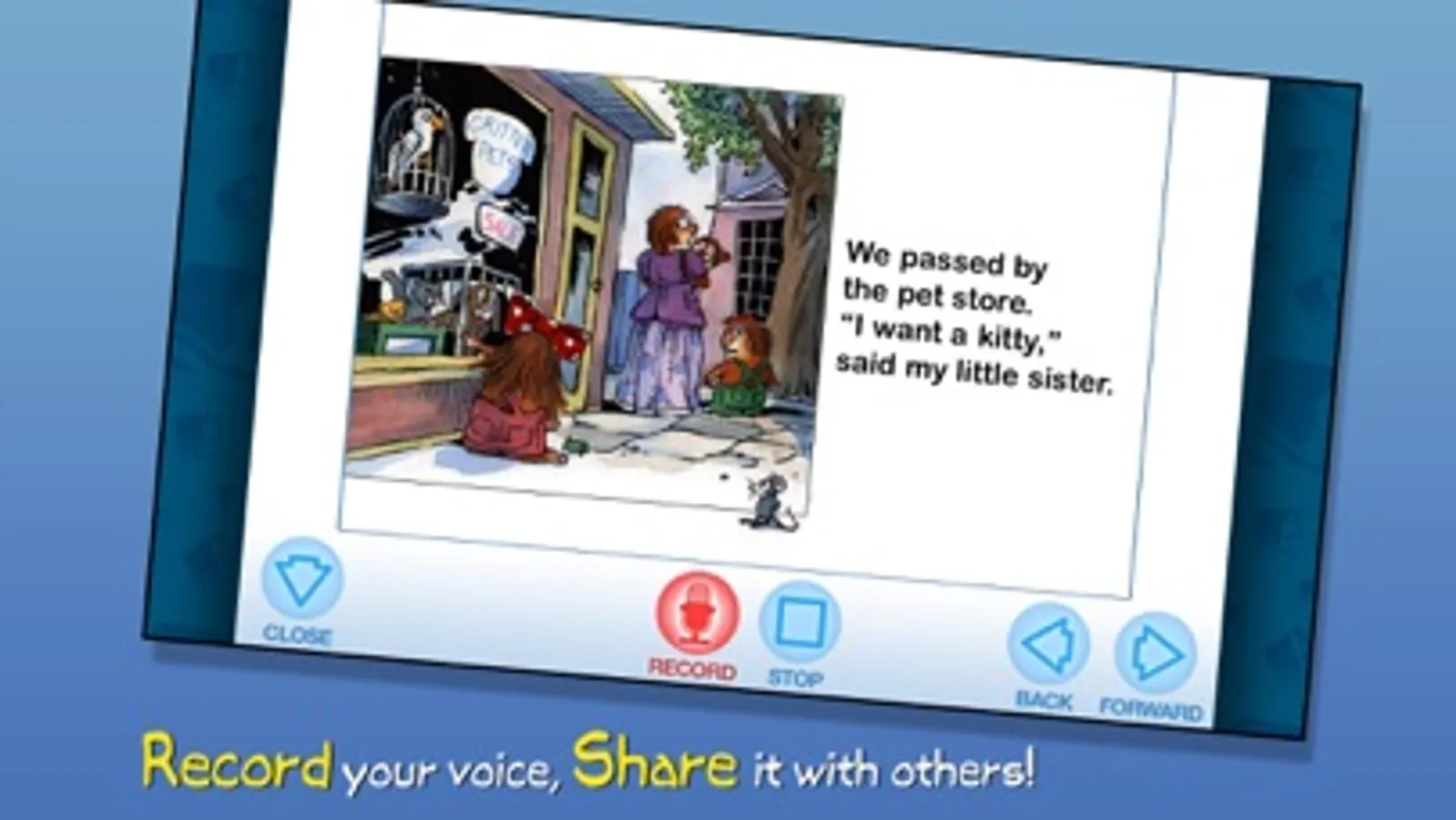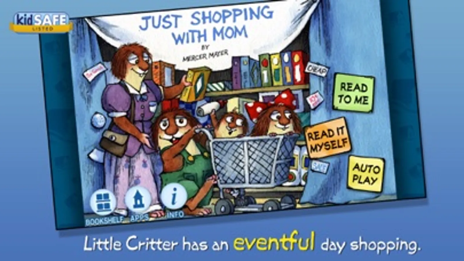 Join Little Critter in this interactive book app as he spends the day shopping with his family! Explore pictures, learn new vocabulary, and personalize the story with your own narration. How will mom find a fun way to reward Little Critter's patience after a busy day at the grocery store and mall?