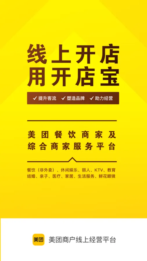 「美团开店宝」是美团餐饮商家及综合商家服务平台,入驻商家可畅享线上开店、营销获客、数据分析、经营资讯等功能。