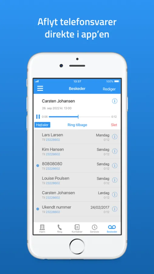 - En visuel telefonsvarer, hvorfra du kan aflytte/slette beskeder og ringe tilbage