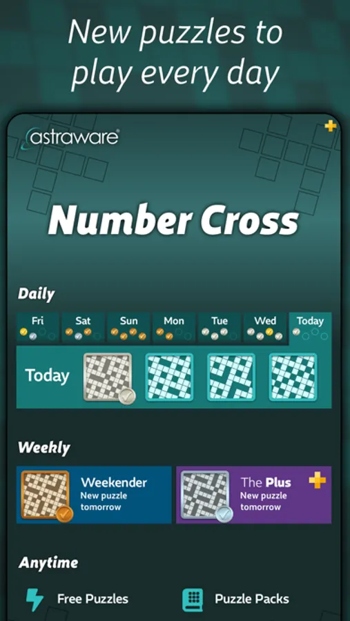 Puzzles Plus is our optional subscription for Astraware Number Cross which entitles you to play all of the available Daily, Weekender and Stream puzzles as soon as they are available, without in-game adverts or any requirement to earn tokens. Subscribers can also choose to highlight their high scores with a choice of badges.