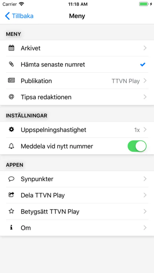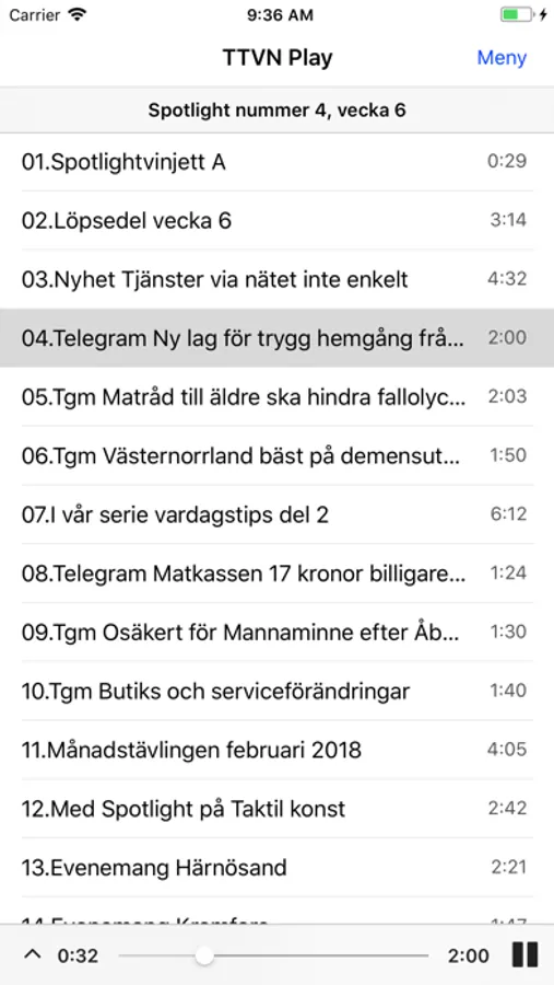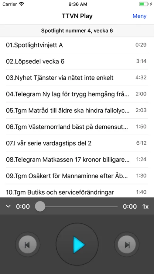 Lyssna på Taltidningen Västernorrland i din iPhone. Installera och starta appen, tryck sedan på spela-knappen och du är igång med lyssningen. Appen ger dig möjlighet att lyssna, pausa, hoppa framåt och bakåt i veckans nummer av taltidningen samt välja artikel från en lista. Appen är anpassad för VoiceOver-funktionen i iPhone vilket gör att du kan använda appen utan att se på bildskärmen.