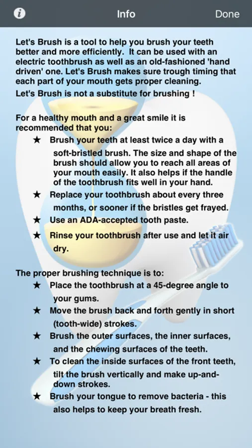 Let's Brush is a tool to help you brush your teeth better and more efficiently. It can be used with an electric toothbrush as well as an old-fashioned 'hand driven' one. Let's Brush makes sure by timing that each part of the mouth gets proper cleaning.