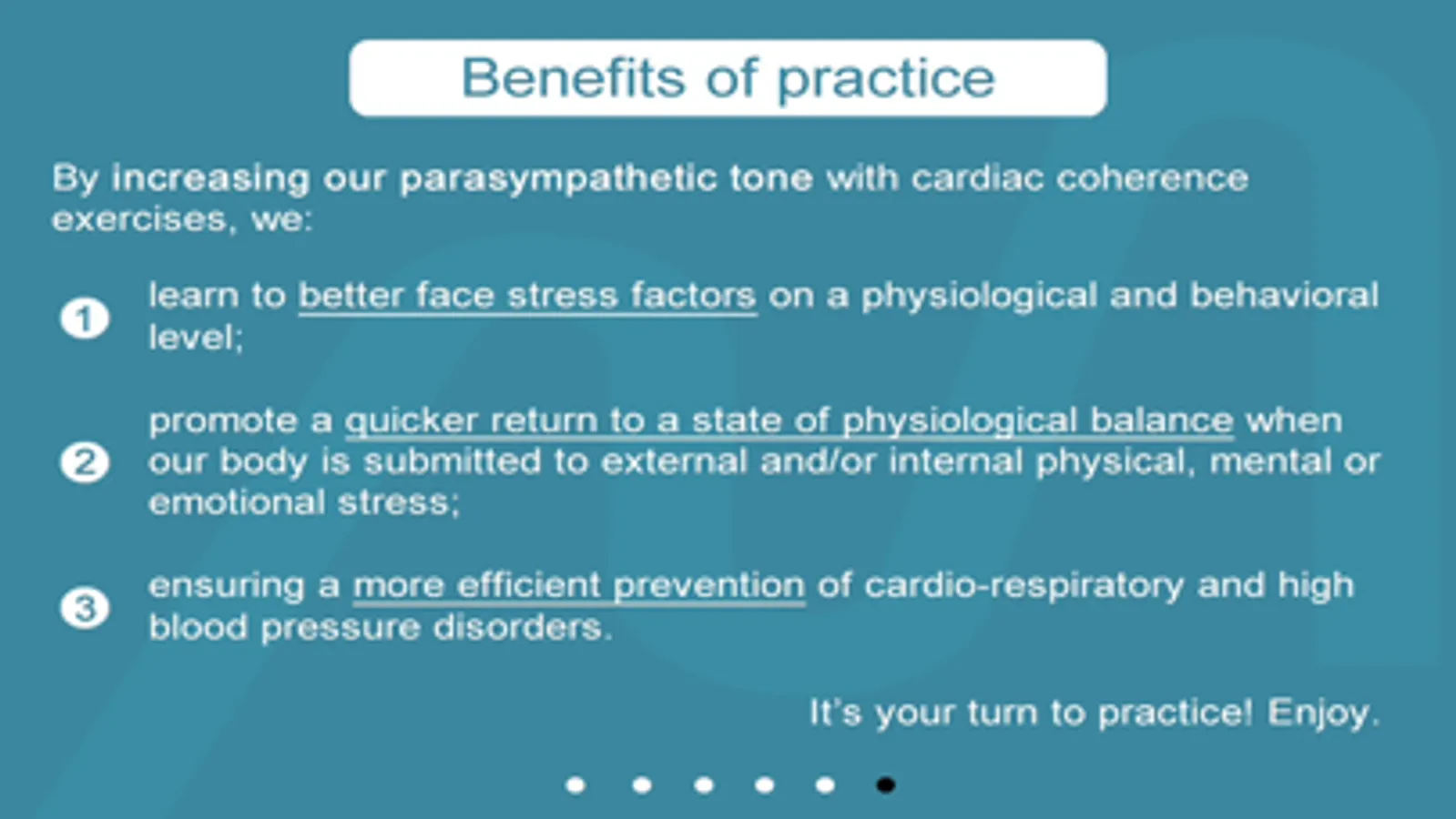 This slow, steady and guided breathing enables synchronizing breathing variations with baroreflex activity, enhancing vagal tone and maximizing the adaptability of the ANS.