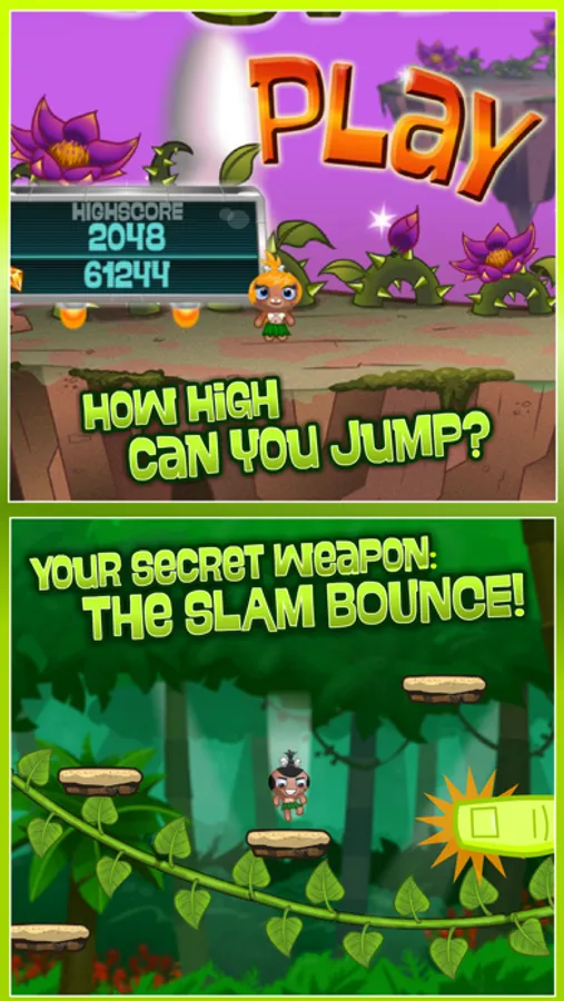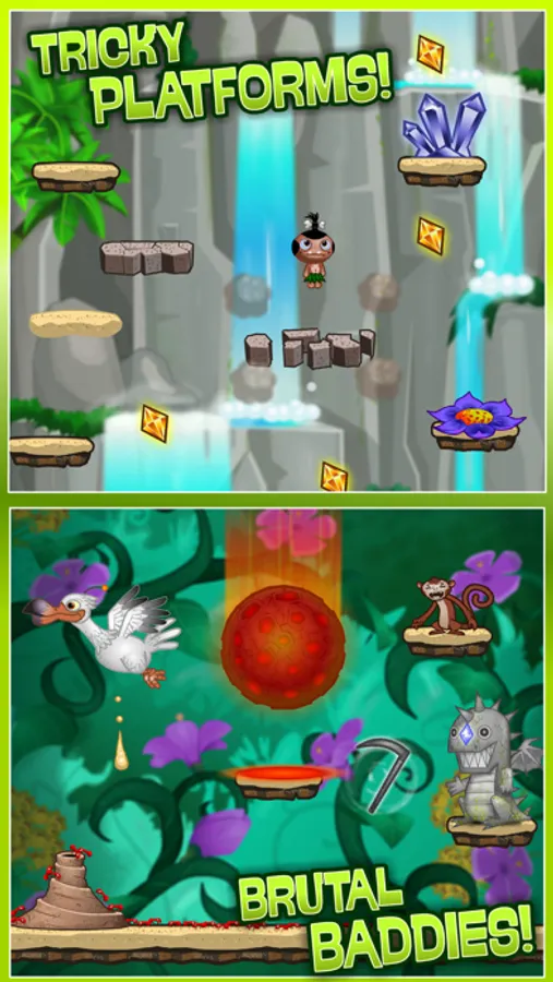 However, your pygmy has a secret weapon: the SLAM BOUNCE! The Slam Bounce increases the pygmy's power, speed and height! Tap the screen to frenetically Slam Bounce your way past tricky platforms and brutal obstacles. The Slam Bounce can also break items that contain hidden gems. In the meantime, your reflexes will be put to the test as monkeys chase you, dodos bomb you, spiders cocoon you, and meteors rain down on you. And that's just the beginning!