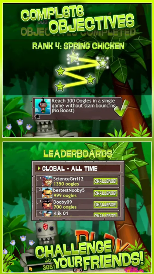 See how many Oogles you can climb as you're grabbing gems, reaching level objectives and acquiring collectibles for your shelf. If you are signed up with Game Center, an in-game leaderboard will show off your high scores and help you keep an eye on your friends' scores. You also see your friends' score markers on wooden signs as you play the game. As you pass their score, Slam Bounce the sign and break it to find a hidden gem. The more Game Center friends you have, the more gems you can collect as you play! You can also challenge them to Oogle-height competitions!
