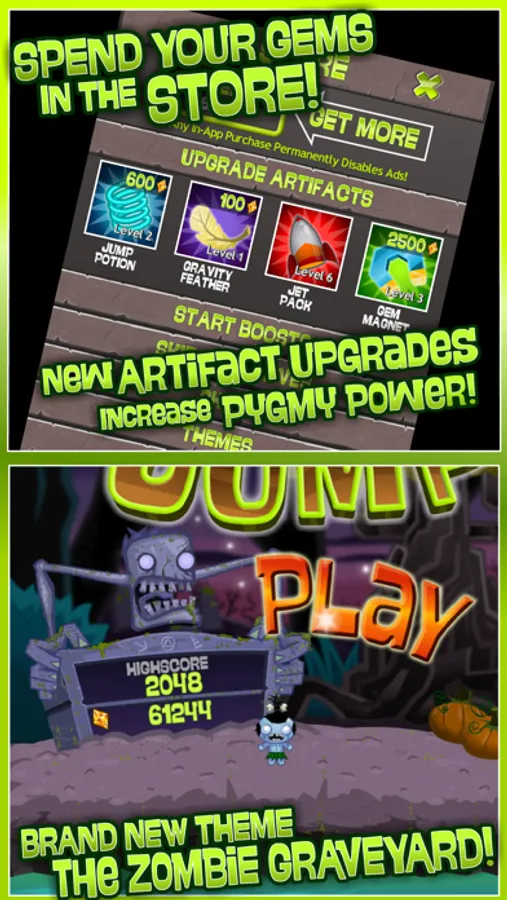 Use your hard-earned gems to buy Artifacts and Boosts in the store to increase your scores. Also available in the store are background themes and pygmy skins. Defy gravity within the spectacularly spacey Uranus Theme, or fire yourself upwards in the hellishly hot Underworld. Plus, for the first time, you can play as the first ever girl-pygmy from the Pocket God Comics, Sun. You can even play as a zombie pygmy. They each have their own special tricks and animations in the game!