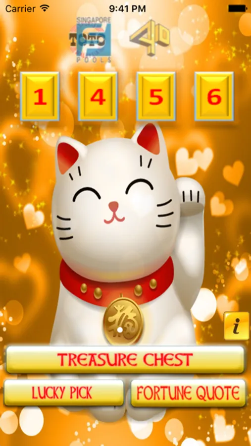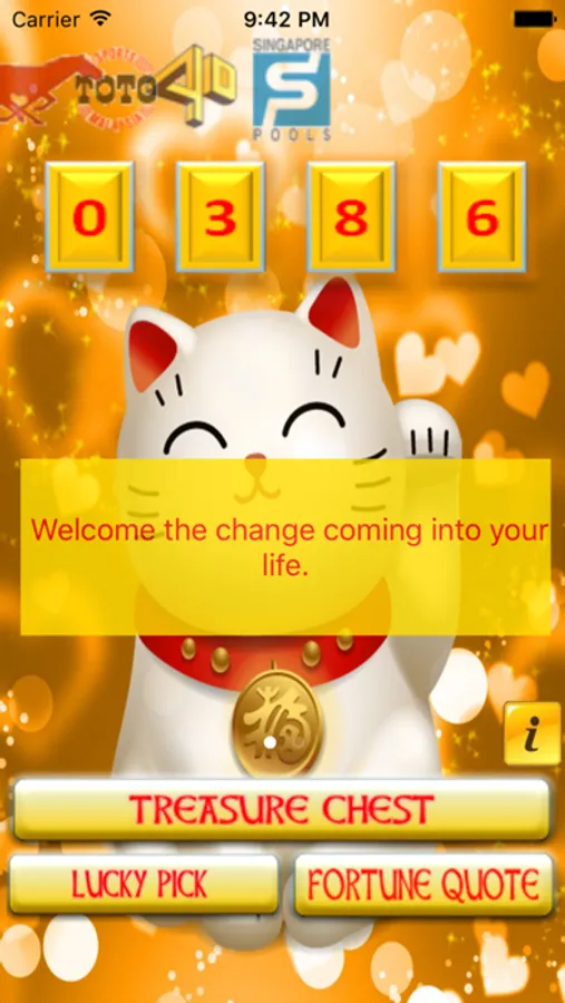 Everyday we are surrounded by happenings, big events to small occasions. There are lucky numbers to be uncovered in all of them! The 4D LUCK treasure chest is equivalent to a special little clandestine chinese book called “Chifa” which correlates numbers to certain objects and actions. You can translate your dreams, incidents, encounters and inspirations into lucky 4D numbers. This is also 4-digit lucky number generator for your favorite Lottery, designed to be fast and easy to use.You can also use the 4D LUCK without internet connection. The 4D LUCK application is also the simplest and prettiest program displaying random fortunes. It has a database of over 1000 fortune quotes and now you can open as many as you want!Get a lucky fortune and see what your destiny bodes you or just read a new thought, start your day with a smile.