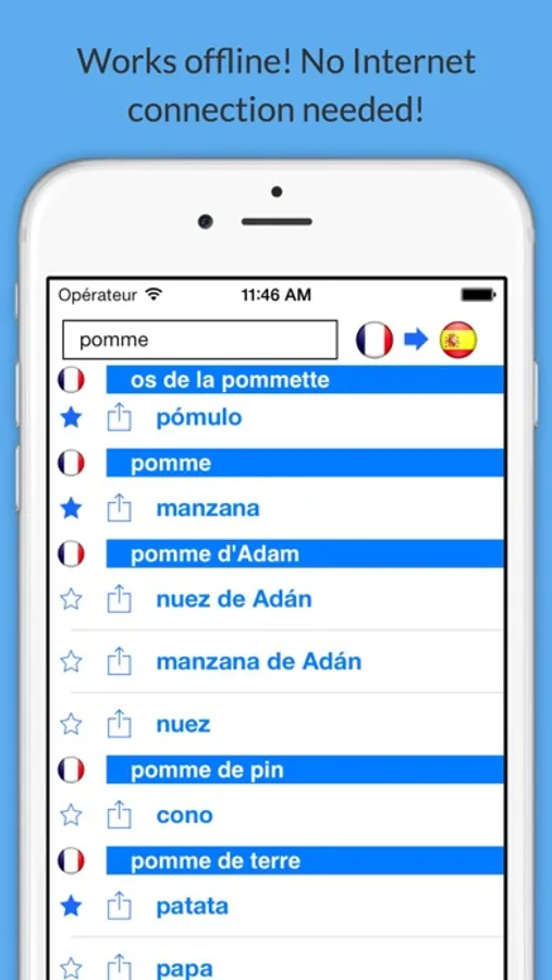 * Works offline! No Internet connection needed, the perfect translator for your trips, your studies, or when no data connection is available.
