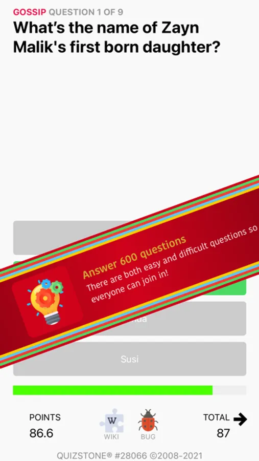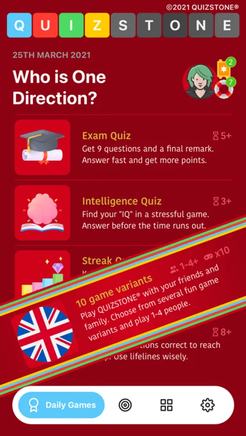 Try games like Exam Quiz, Intelligence Quiz, Stretch Quiz, Millionaire Quiz, Eternity Quiz, Category Quiz, Quiz Bomb, Reaction Quiz, Duel Quiz, Party Quiz and Quiz Show.
