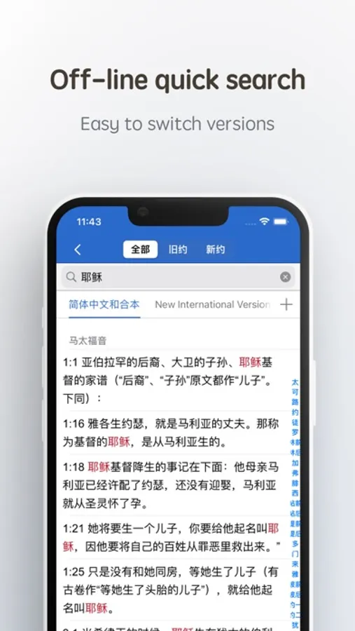 - Search: Quickly find keywords, support book title chapter search, such as: Matt. 19:28; John 3:3,5,7;