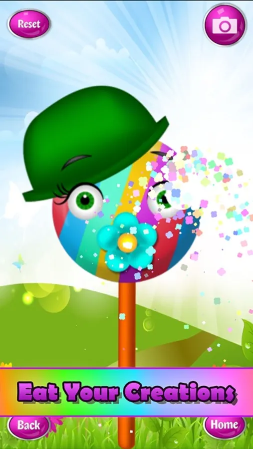 Change different backgrounds including rainbow, winter, beach and much more! Then go to eat the candy creation!! Take a Photo, Eat Candy or go back to decorate more!