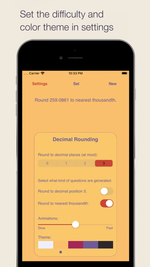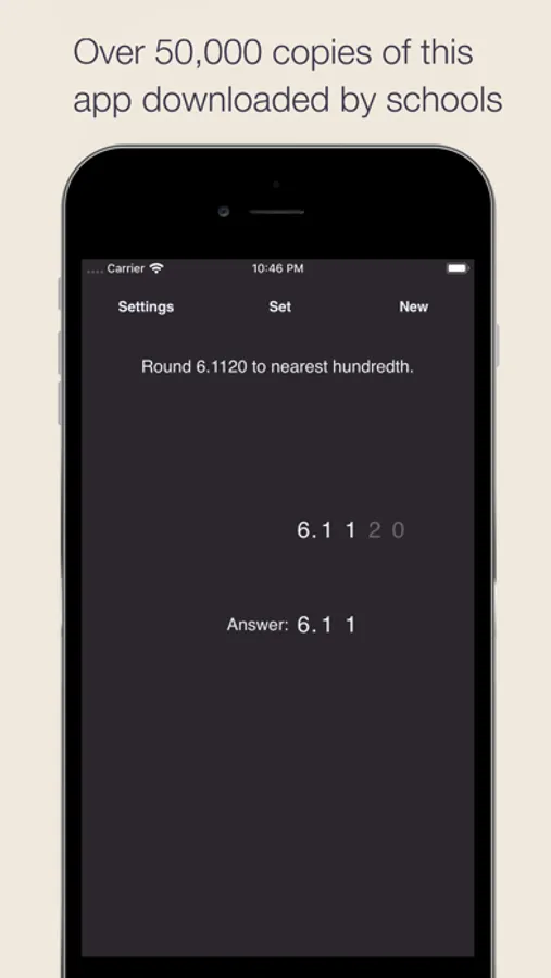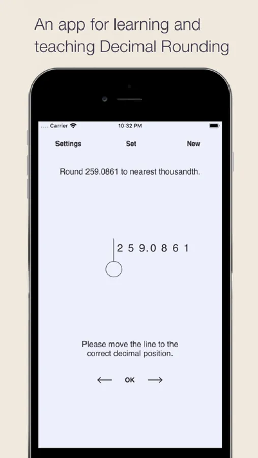 This math app can be used to teach and study the rounding of decimals. You can set your own problems or solve random problems. The decimal numbers can be rounded to nearest whole number, tenth, hundredth or thousandth. They can also be rounded to 0, 1, 2 or 3 decimal places.