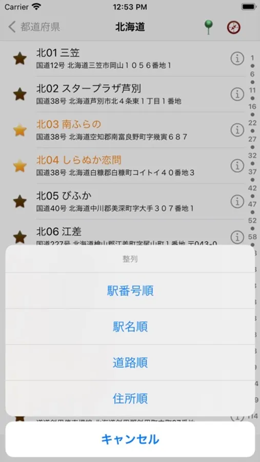 8、「駅番号順」、「駅名順」、「道路順」と「住所順」四つの表示順番があります。