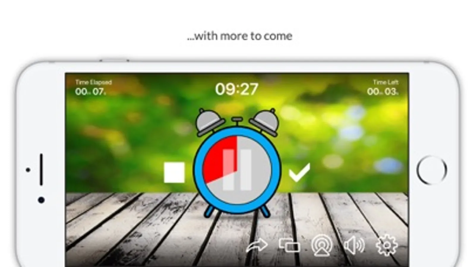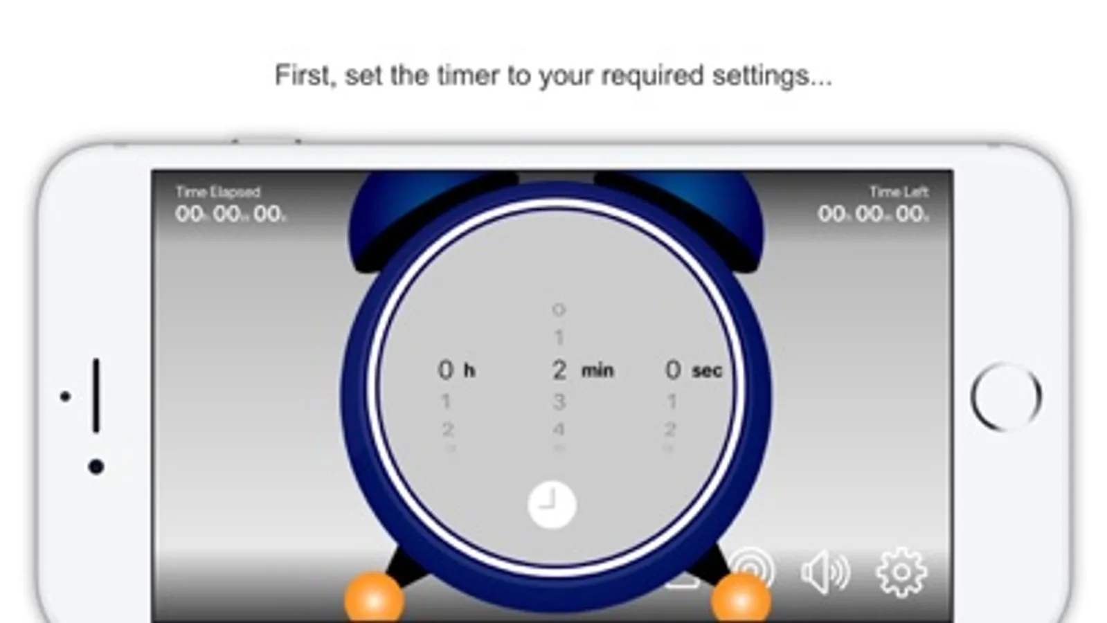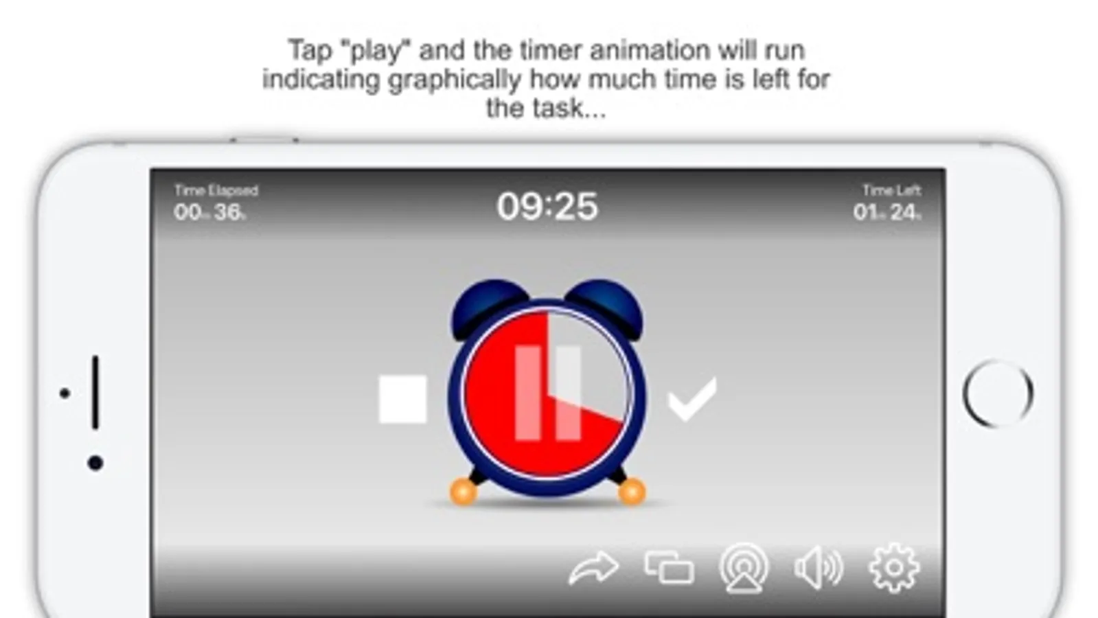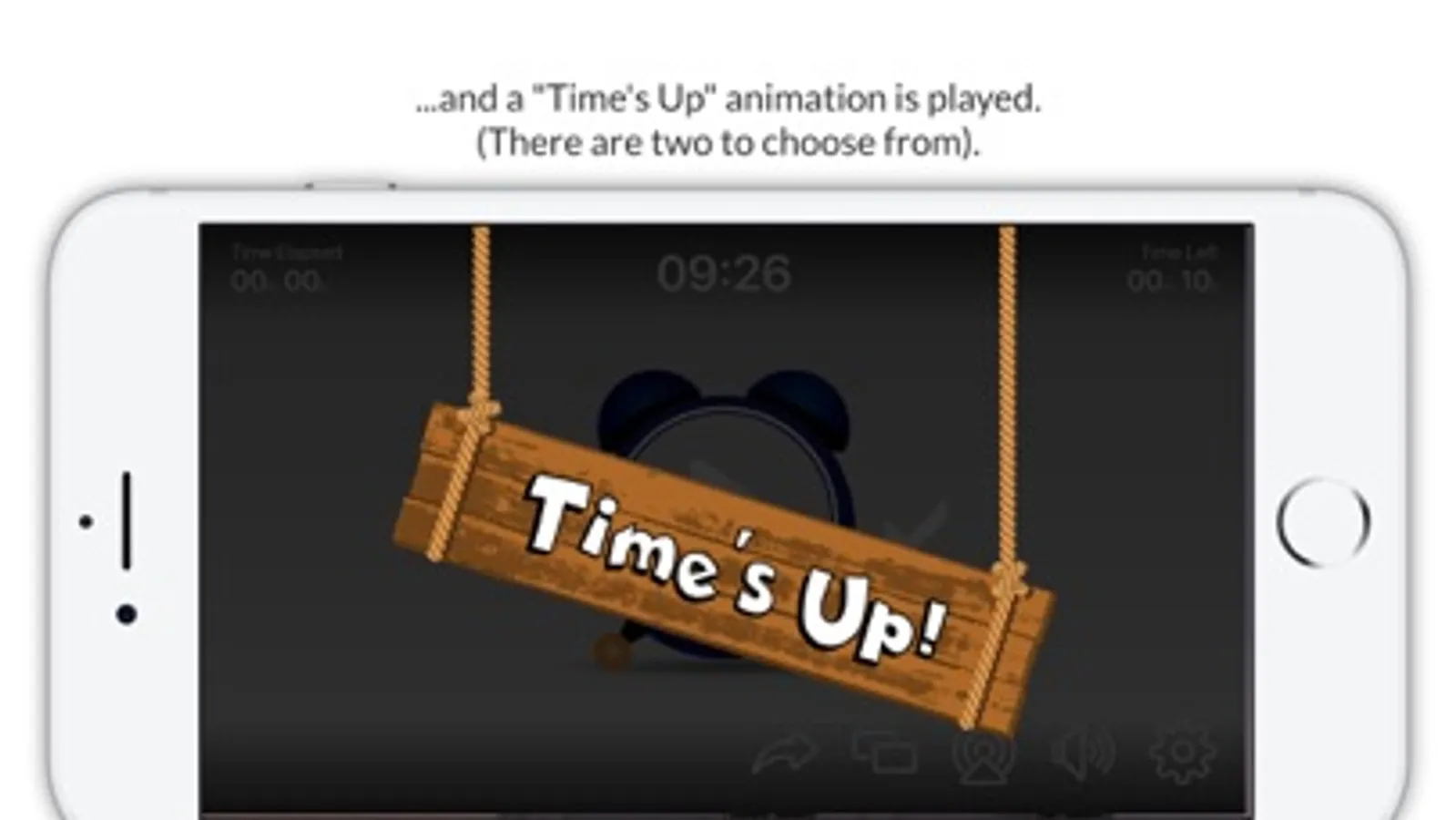 The user is able to pause, restart and reset the timer at any time. The app has an audible "ticking" sound when the timer is running, this can be enabled or disabled by tapping the speaker button on the apps main screen. The Fanfare and Explosion sound effects can be controlled via the audio controls on the Apple device.