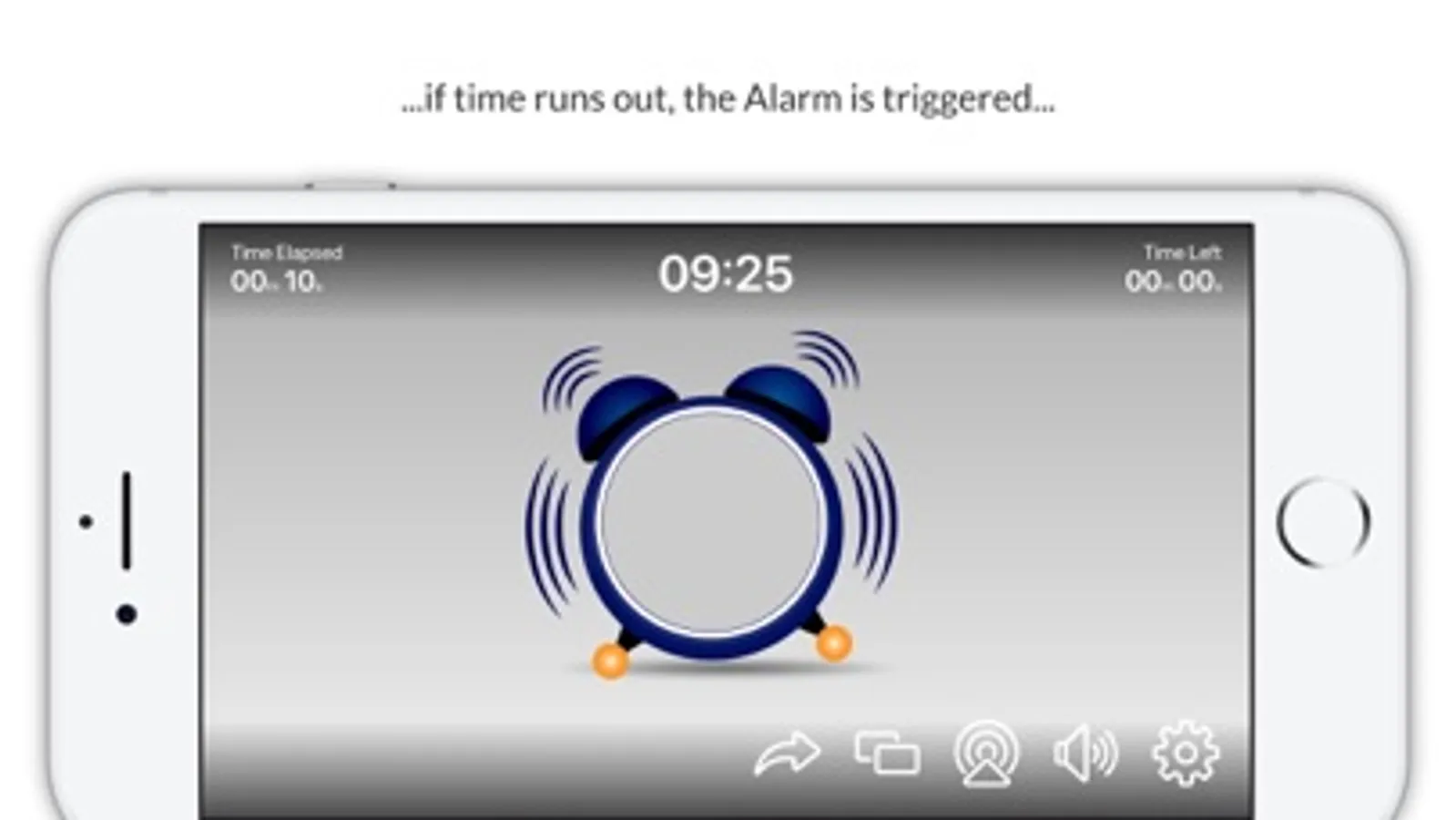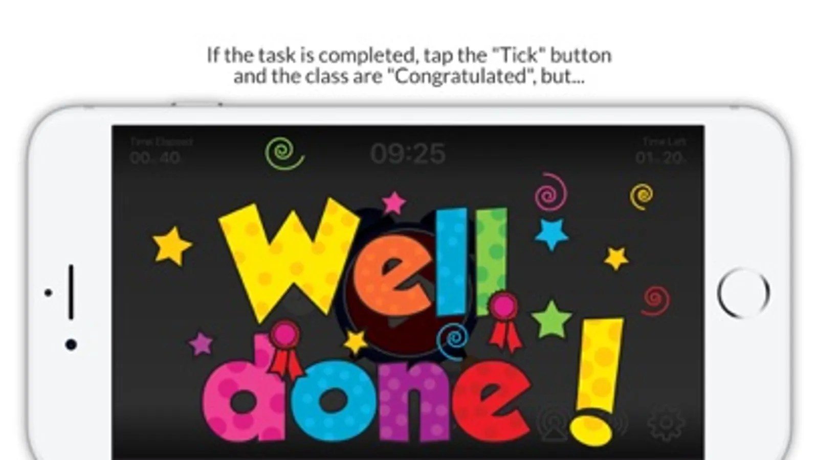 If the class completes the task in the defined time limit the teacher can tap the "tick" button and the "Well Done" screen is displayed and a fanfare sound effect is played. However, if the class run out of time the Alarm rings on the clock, the clock bounces around the screen. Then either: