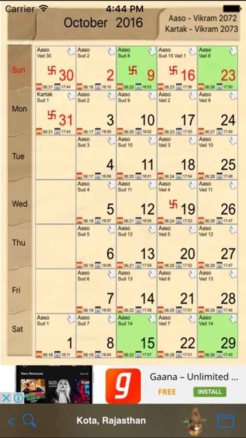 This is a Jain Tithi Panchang for Vikram Samvat 2070 (English years 2013-14). The calendar provides Tithis and significant events throughout the year as perceived by Digambar Jains. The Aatham & Chaudas are marked distinctly in green. The accurate sunrise & sunset timings of several locations in India can be ascertained.