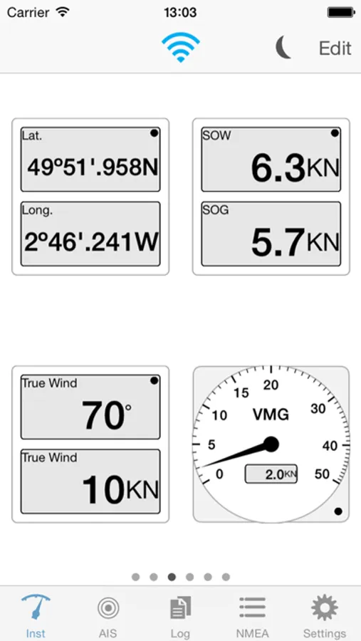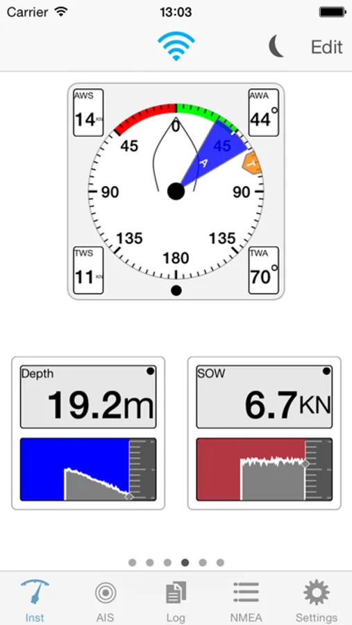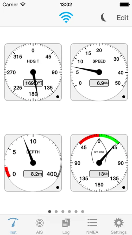 ● Depth, speed, course, wind, location, rudder, rpm. More instruments in future versions.