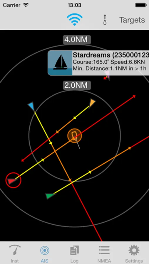 The AIS screen shows relative position, speed and course for nearby targets that the on board AIS receiver is reporting. A minimum safe distance can be used to show warnings about potential collisions. The relative direction of travel of targets is shown in colours to indicate relative position in 5, 10 and 20 minutes.