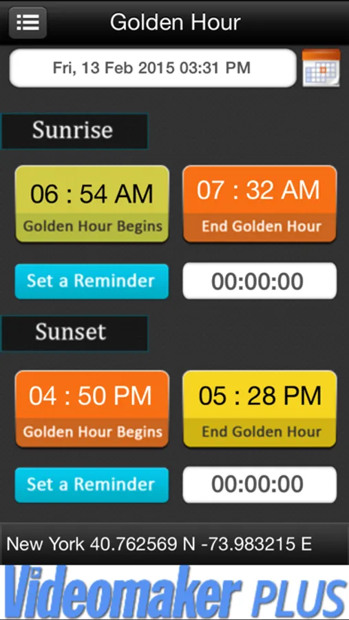 Golden light is a golden hour calculator that tells you when the sun rises and sets on any day at any place on earth. It will give you a window of time when the sunlight is perfect for photos, video, or film. Tell Golden Light where you're shooting by choosing a location on a map or from a list of countries and cities. Set a reminder for when golden hour begins or ends. With Golden Light, you'll never miss that perfect opportunity for perfect light!