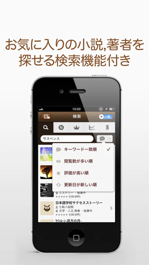 検索結果は「一致順」「閲覧数順」「評価順」「更新日順」で並び替えできます。
