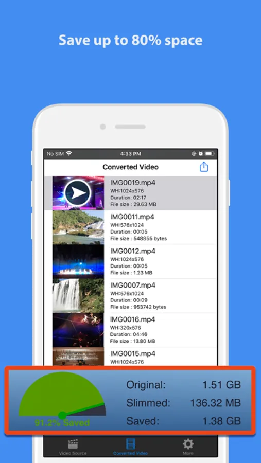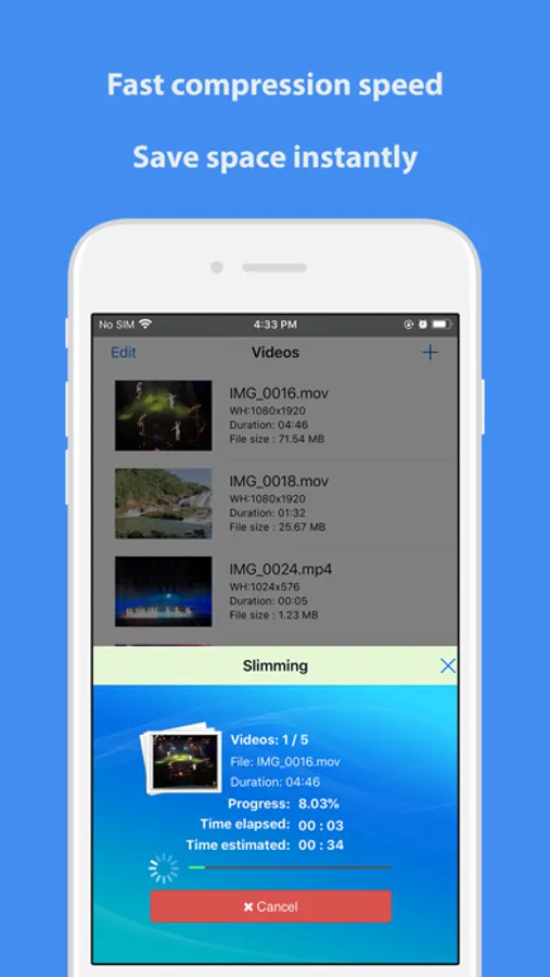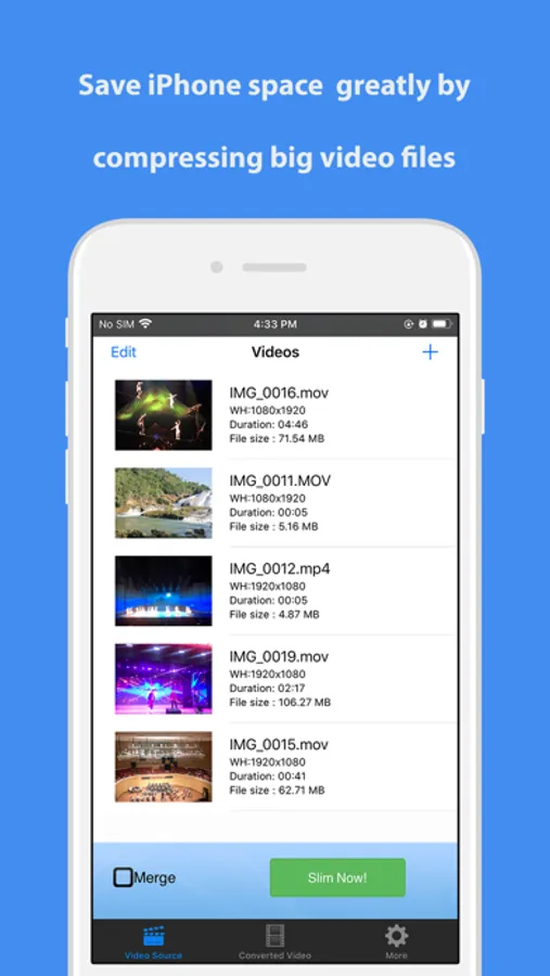 The video files you shot with iPhone, iPad or iPad Pro are very huge. A 5 minutes video can take up to 0.5G space, with Video Slimmer App, you can save up to 80% space in a snap.
