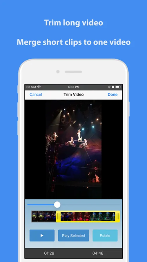 You can trim long video or merge short video clips. To join short video clips or remove unwanted part of videos with this Video Slimmer App becomes so easy.