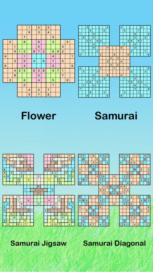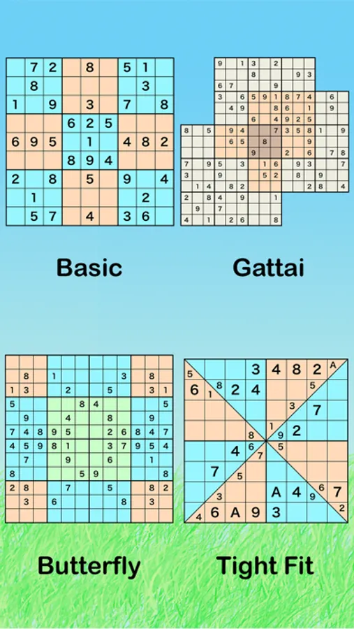 - Various types of Sudokus, including Gattai (3 overlapping sudoku grids), Butterfly (4 overlapping sudoku grids), etc.