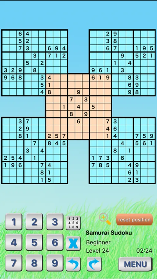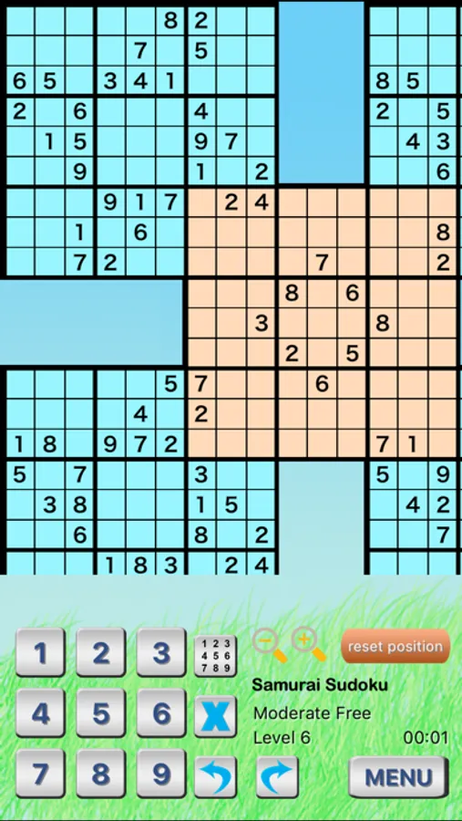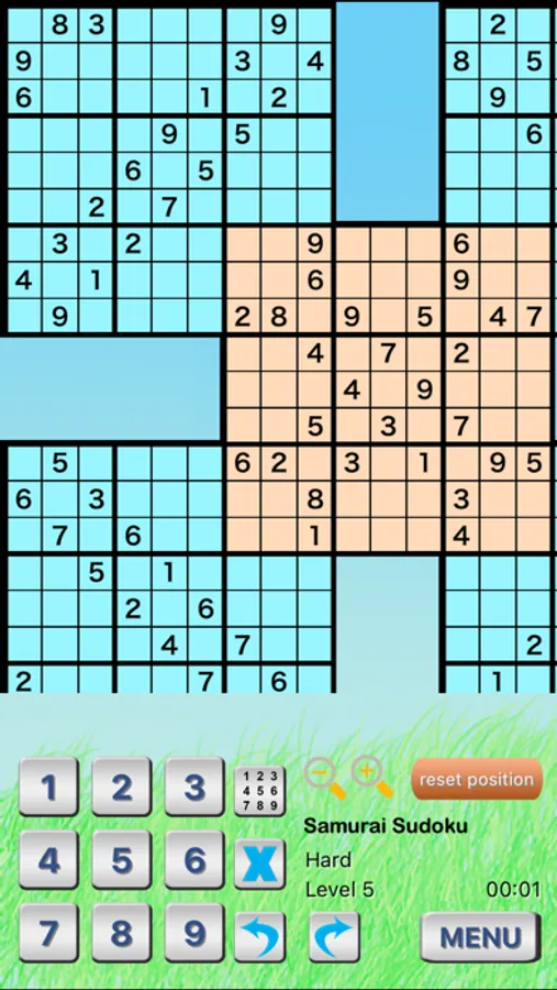 Samurai Sudoku puzzle contains five overlapping sudoku grids. The basic sudoku rules apply to each 9 x 9 grid.