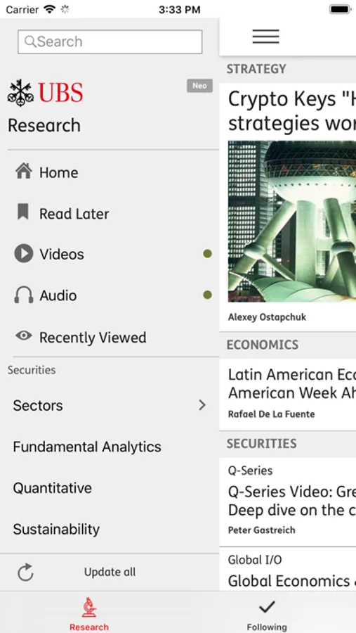 The UBS Neo Research App, available via iPad® and iPhone®, provides institutional clients speedy access to UBS’s award-winning Investment Bank Research anytime, anywhere.