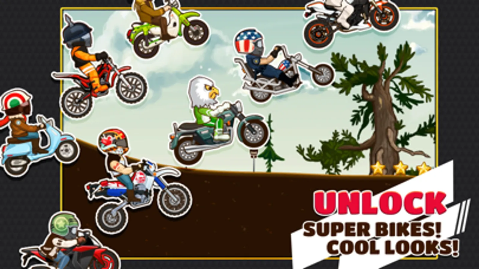 Choose your favorite bike, from a collection of scooters, dirt bikes, cruisers and speed bikes! Customize your ride with paint jobs and use all-new power-ups to achieve the best scores!