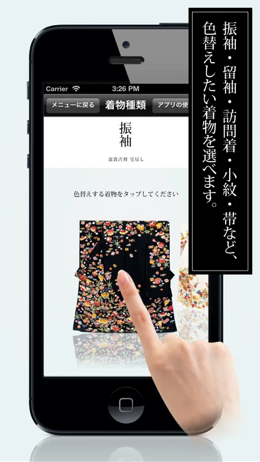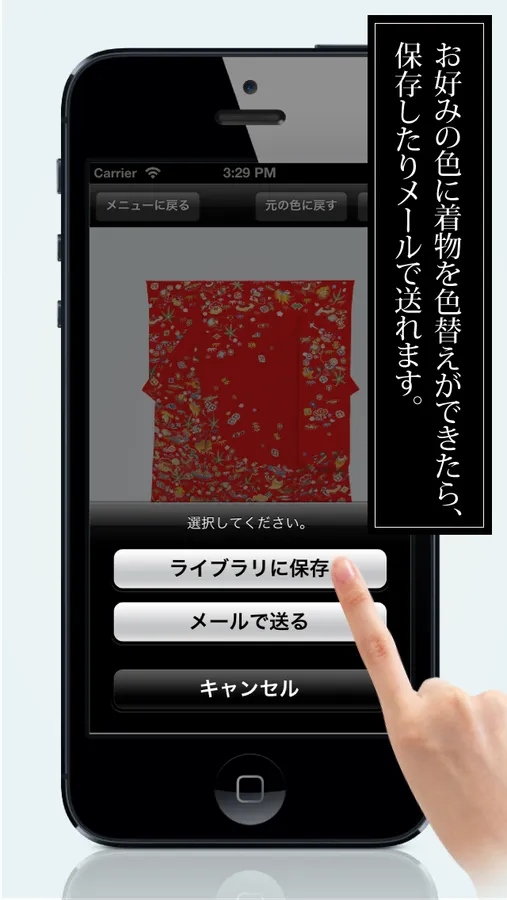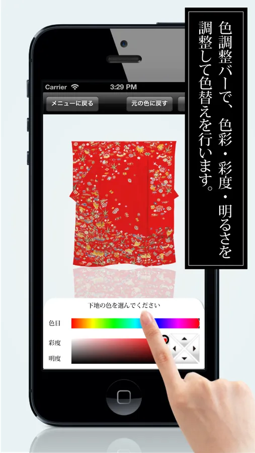 This application can change the color and chroma saturation of the ground of a kimono, or a design.