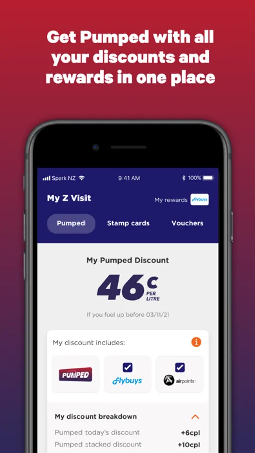 • Access your combined fuel discounts with Pumped & collect rewards when you add Flybuys or Airpoints™