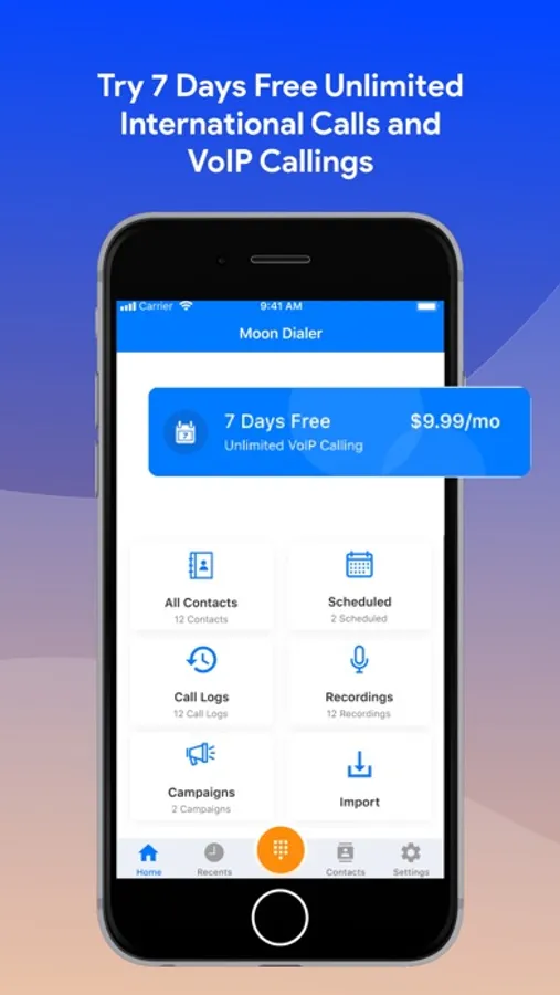 Moon Dialer is the #1 iOS internet calling application for call recording, WiFi and international calling purposes. Making it the best auto dialer in the market. It is a multipurpose app that lets you access many features simultaneously. Moon Dialer is a smart calling app that effectively allows importing contacts, sorting, filtering, free calling, voice call using wifi, and much more. worldwide calling can be quickly done with the best VoIP dialer app from Moon Dialer. If you would like to start international calling or calls over WiFi with unlimited call recordings, this app is for you.