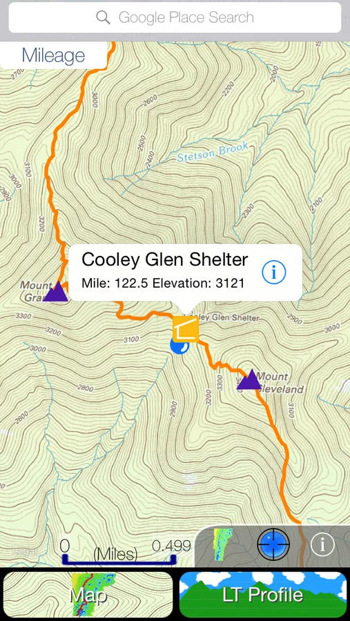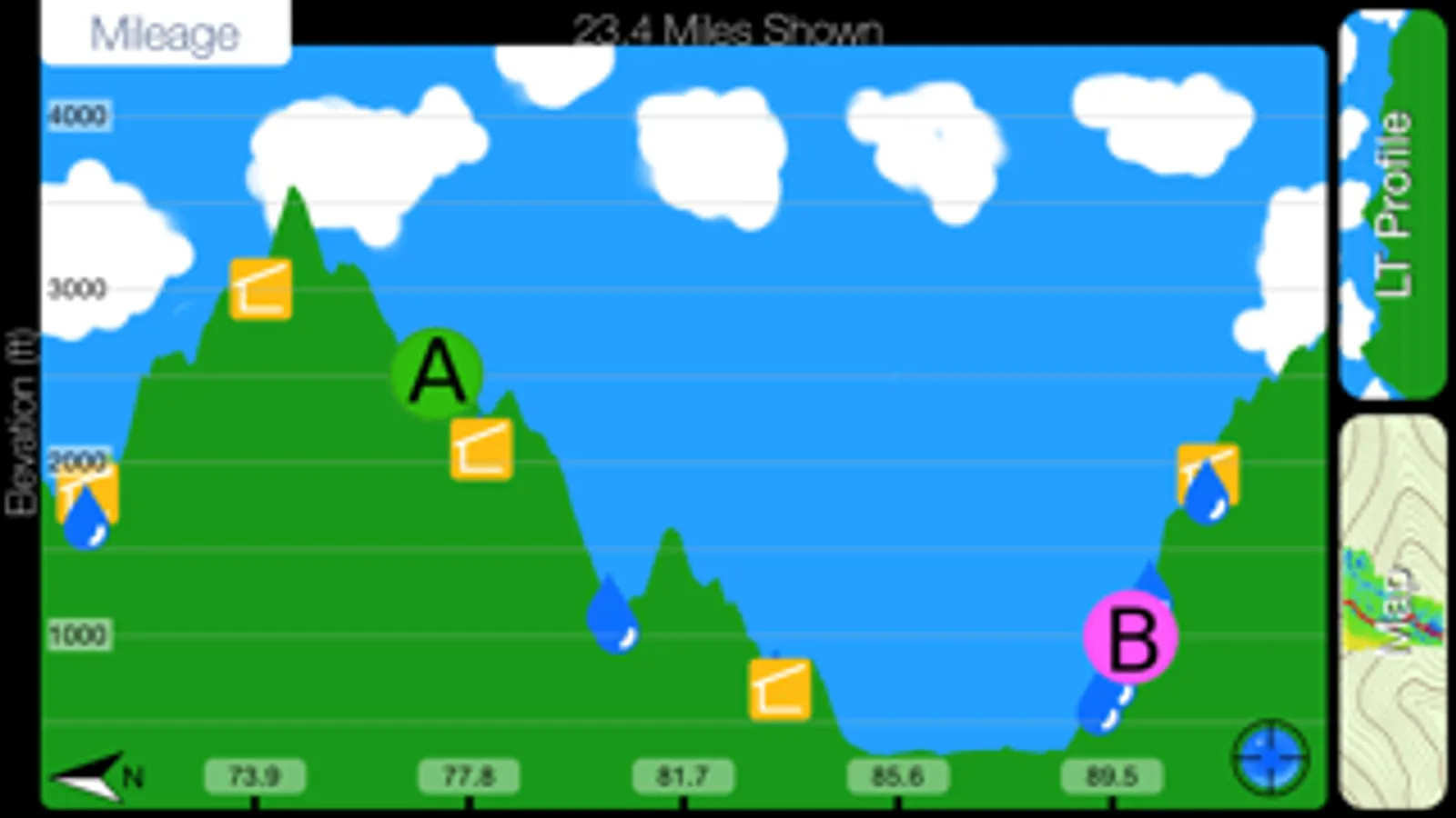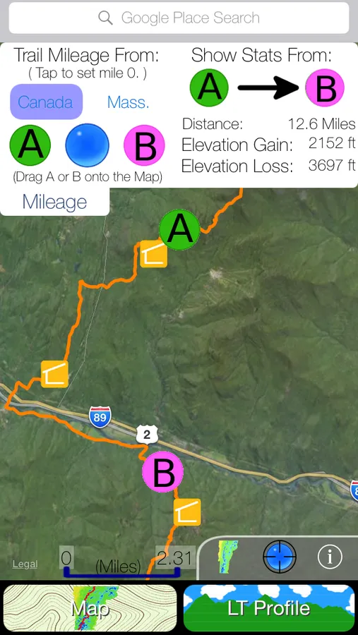 The convenient mileage menu calculates distance between any two points on the map and integrates with an interactive profile graph of the Long Trail to show elevation gain/loss over Vermont’s highest peaks.