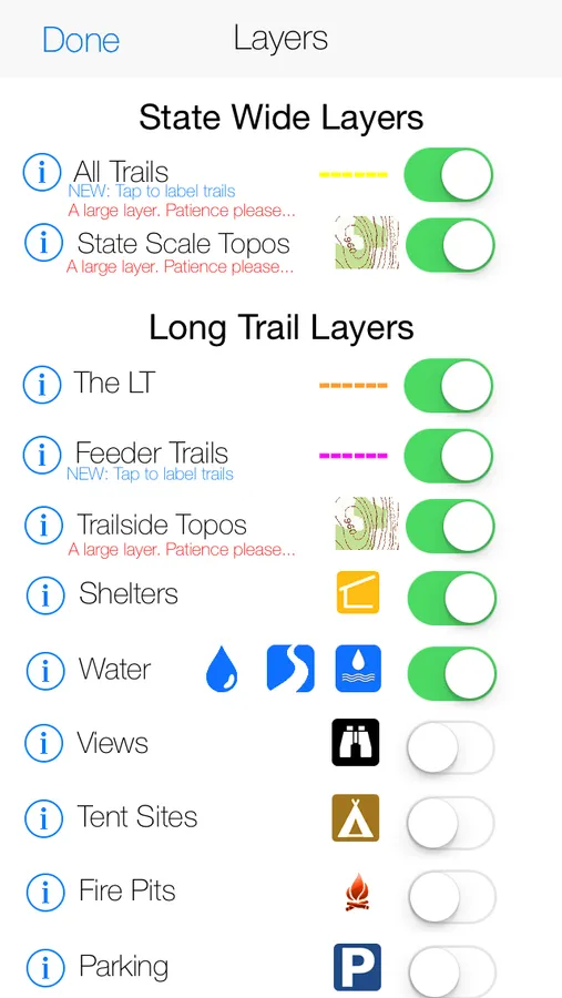 -Hundreds more waypoints including: tent sights, views, fire pits, parking, summits, towers and gaps.