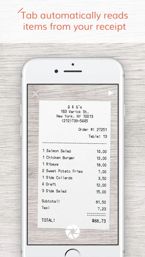 - Take a picture of your itemized receipt. Tab automatically detects all the items and prices.