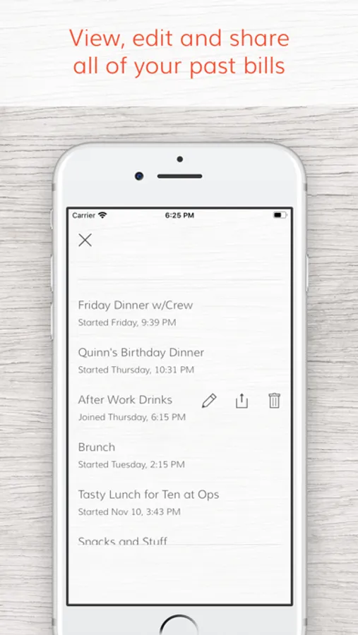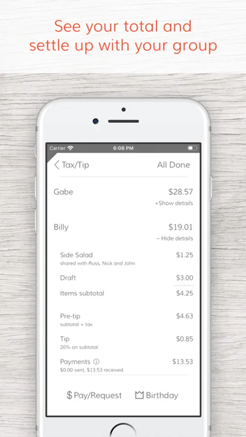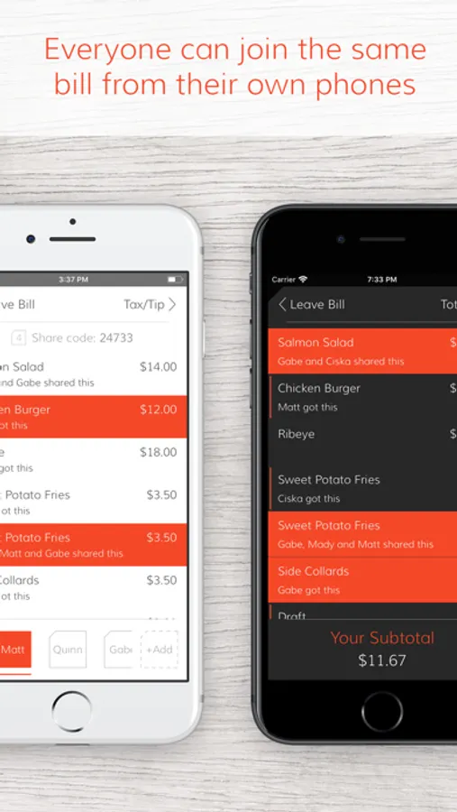 - Select which items each person ordered. Everyone that has Tab on their phone can join onto the bill and select their own items - the app keeps everything synced in real-time.