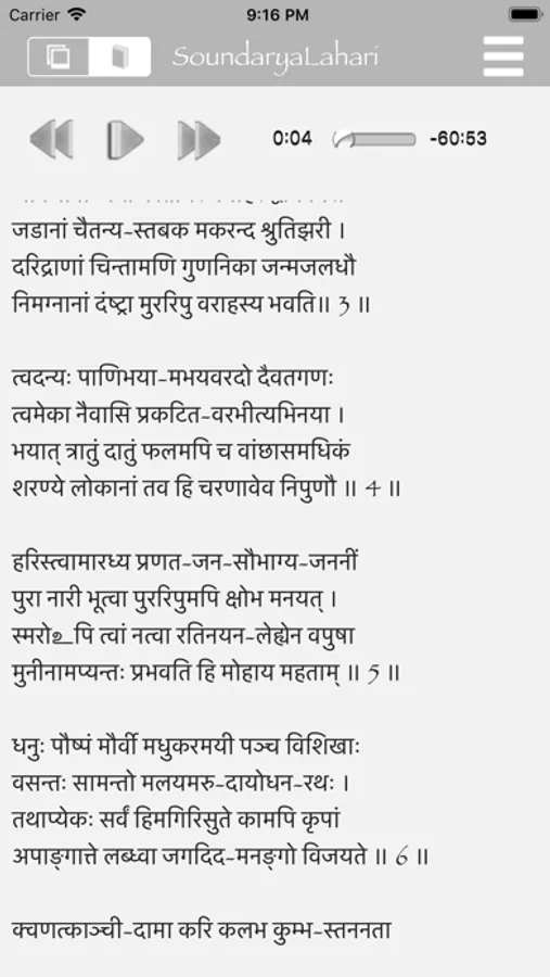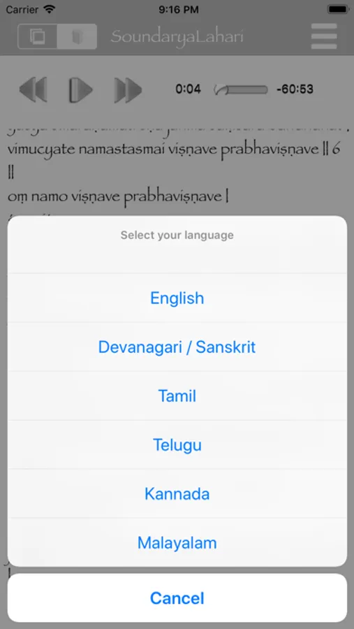 * Lyrics available in English,Thamil ,Sanskrit,Telugu,kannada & Malayalam (User can select different languages for lyrics using BOOK icon in the top left corner).