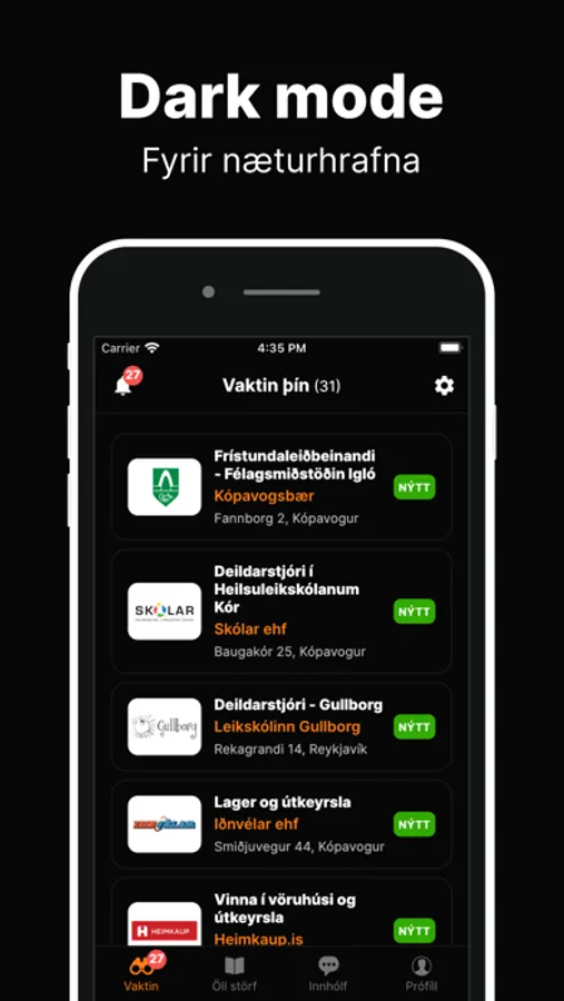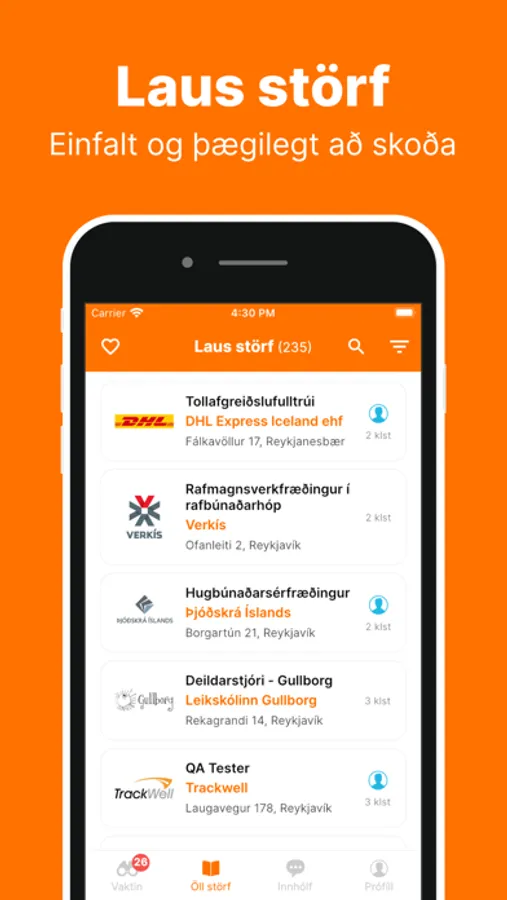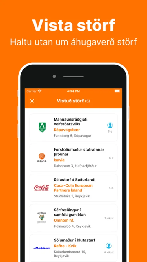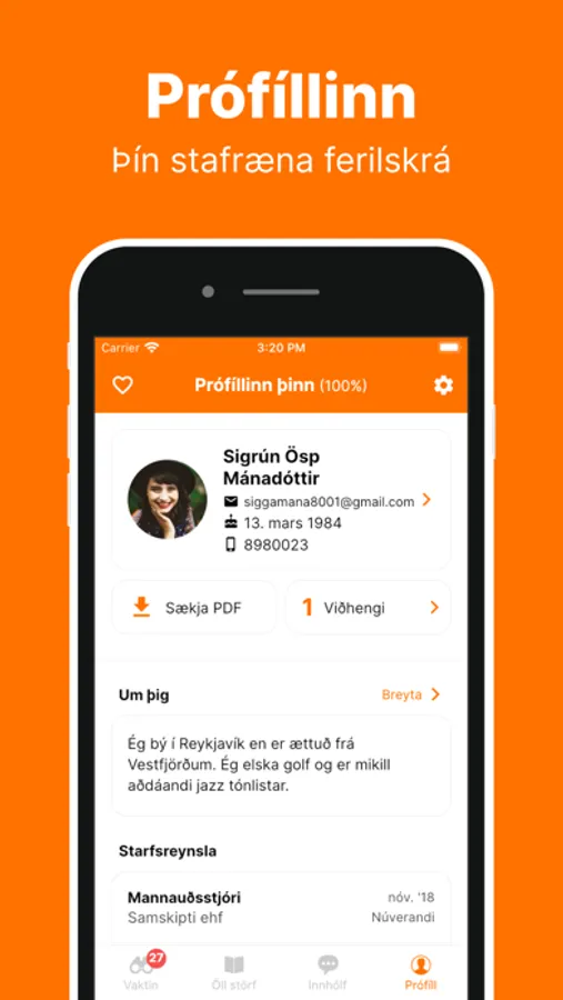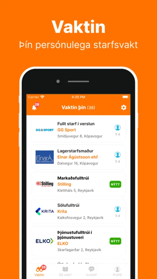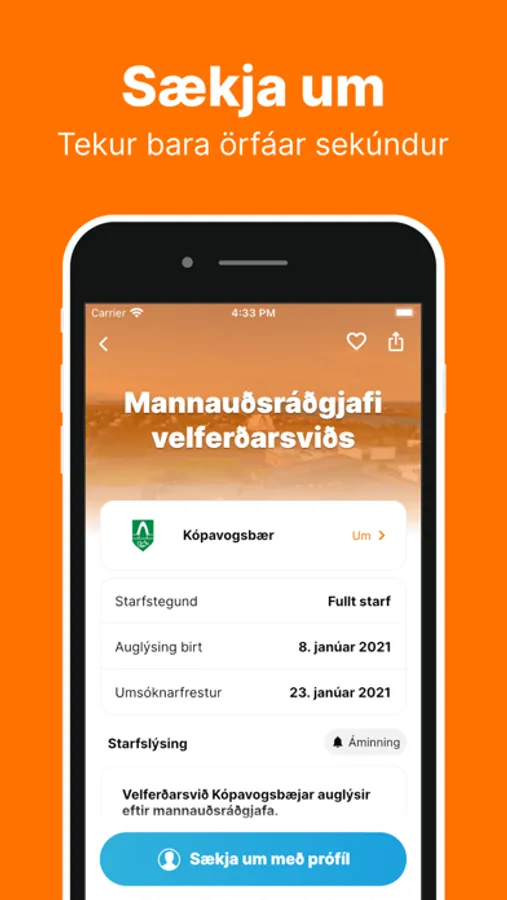 ● Prófíll: Fylltu prófílinn þinn út og þá getur þú sótt um með einum smelli þegar þú sérð spennandi starf í boði.