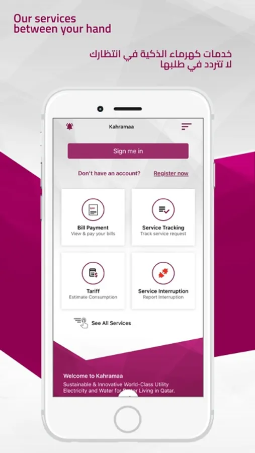 التطبيق الرسمي للمؤسسة العامة القطرية للكهرباء والماء "كهرماء" والذي يقوم بتوفير خدمات إلكترونية متعدده للمشتركين كالأتي:
