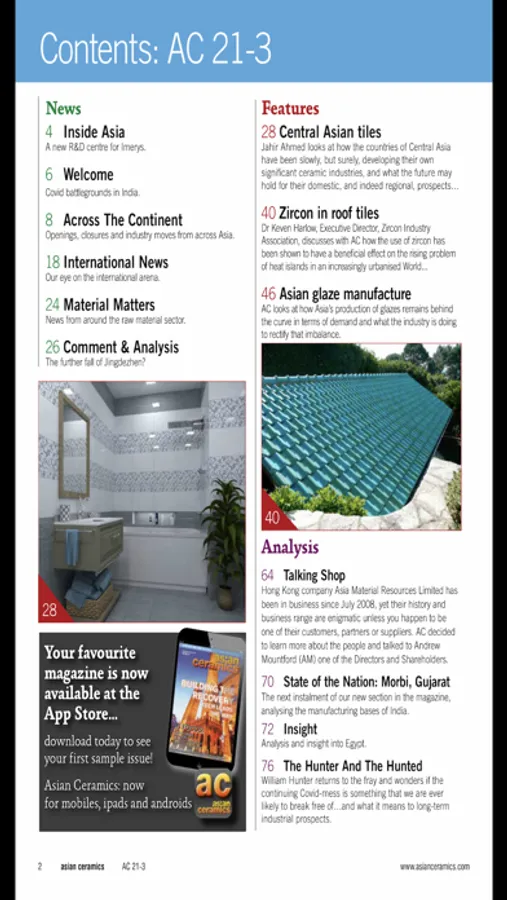 Asian Ceramics magazine is the leading industry title for the world’s ceramics industry professionals. With a dedicated focus into market trends, supply and demand and technological developments across all of Asia, the Asian Ceramics App ensures you are kept fully up to date with the information you need to make strategic decisions with regards to your ceramics business. Covering the entire continent, from Turkey to China, Asian Ceramics supplies “must have” market research on a monthly basis, as well as news, views and industry interviews with key leading personnel in Asia’s – and the world’s – ceramics industries. Whatever your location, the ceramics manufacturing industries of the Asian continent are having a direct influence on your local and regional industry. Make sure you don’t miss the opportunities that this exciting sector presents, or are caught unawares by the challenges it causes. Download the Asian Ceramics App and keep yourself informed and at the cutting edge.