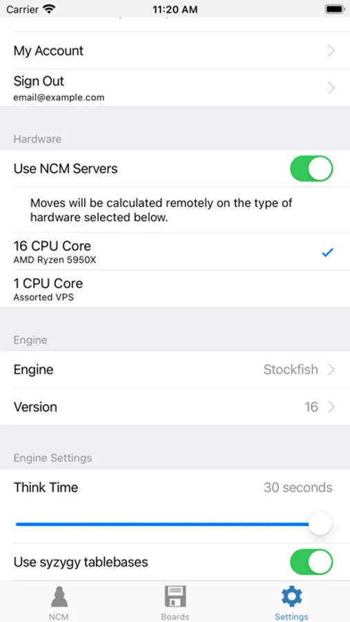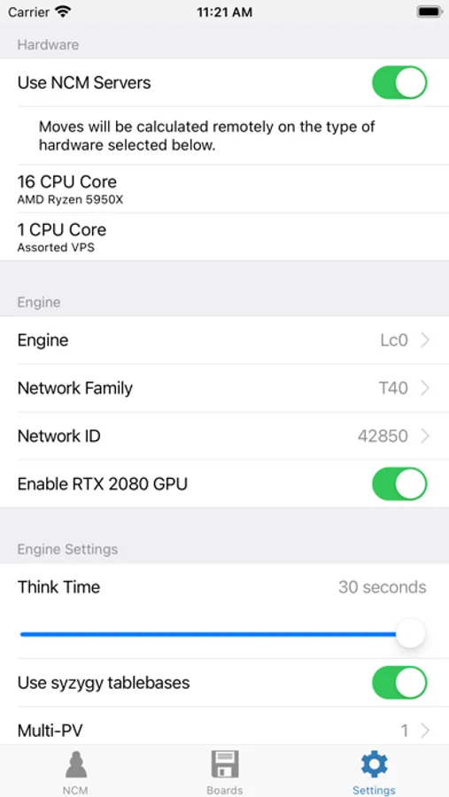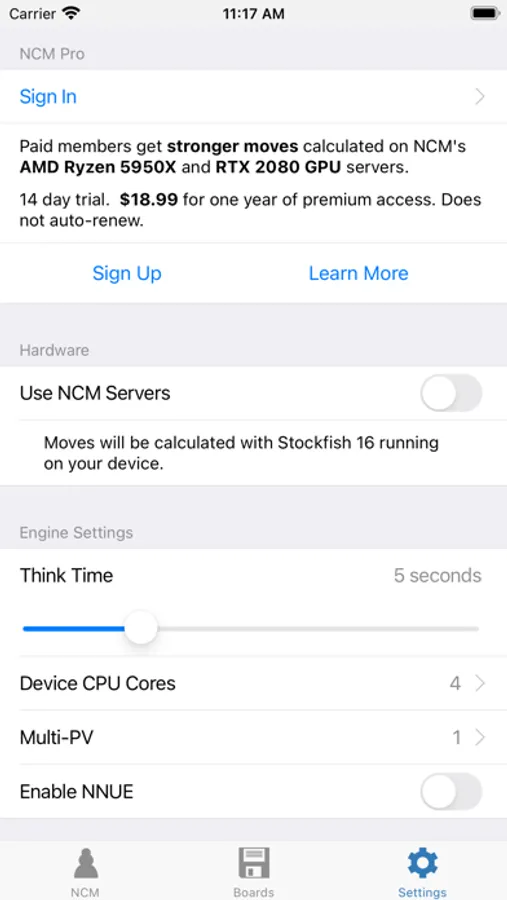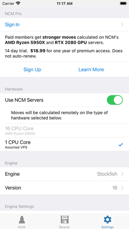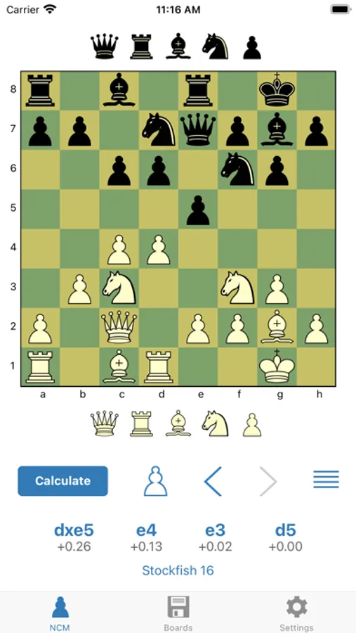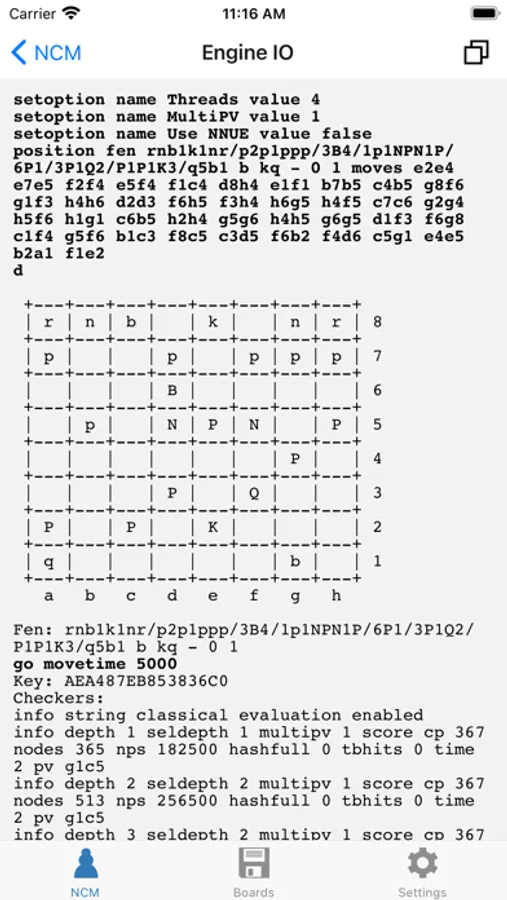 NCM is a powerful chess calculator that runs Stockfish 15.1 directly on your device. The app also includes free access to a growing list of engines running on NCM's remote single core CPU hardware:
